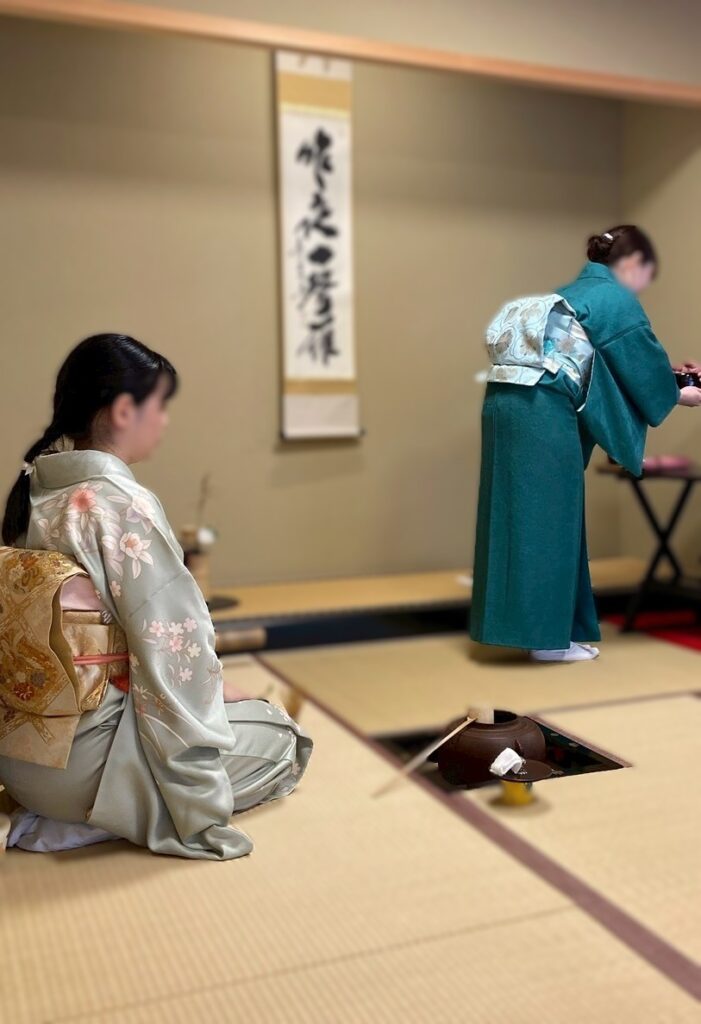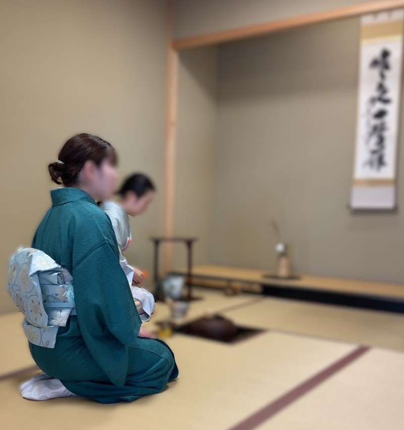 お着物は先生にお借りしたものです。自分では緑の着物という選択は今までになかったのですごく新鮮な気持ちでした。お茶席が始まるまでの緊張する間も、お着物を着たサークルの皆さんと写真を撮りあったり、メイクや髪型について話したりできてとても楽しかったです💚